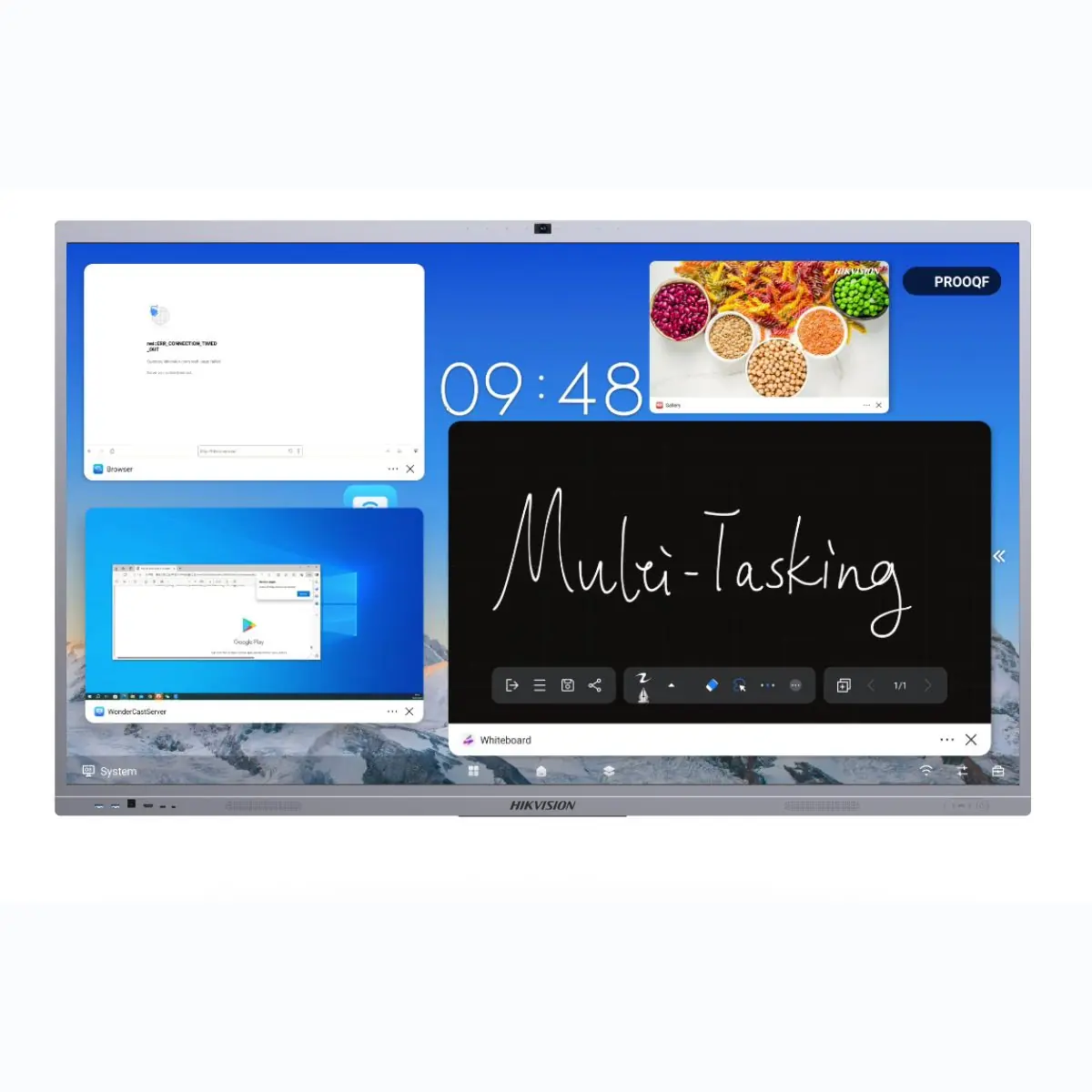 - De projectie draadloos van documenten. Maximaal vier deelnemers kunnen hun scherminhoud tegelijkertijd naar de smart board uitzenden. Er zijn verschillende oplossingen beschikbaar: de WonderCast -app om te downloaden op uw apparaat, Miracast, AirPlay. U kunt delen vanaf verschillende apparaten: PC Windows, smartphones Android, Mac, iPhone, iPad. Een dongle draadloos is ook als optie verkrijgbaar.