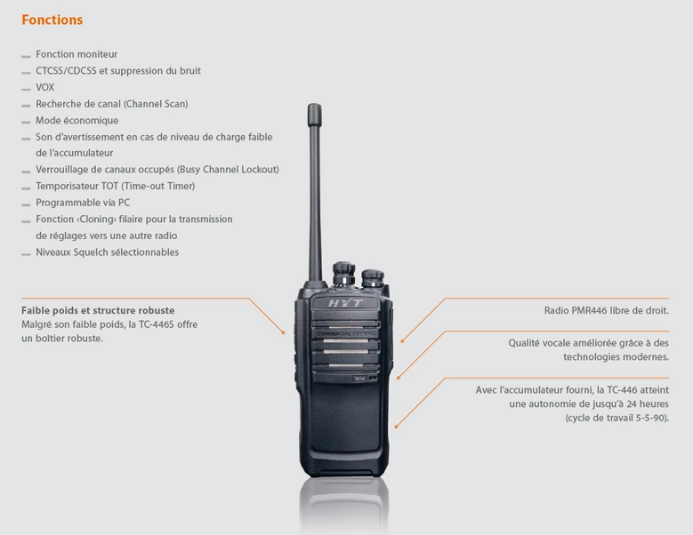 De nieuwe generatie HYT 446S heeft nog steeds een vermogen van 0,5 W en biedt een bereik van 500 tot 1500 meter in stedelijke gebieden en 3 tot 8 km in open terrein (afhankelijk van het terrein). Voldoet aan de IP55-norm. , de HYT TC446S-ENH Bestand tegen schokken, stof en spatten. Het omvat de Vox-functie. De portofoon TC446 S is toegankelijk via een schakelaar op de PTT-knop en kan worden geactiveerd met een spraakopdracht. Indicatielampjes geven de status van het apparaat weer: zenden of ontvangen, batterijniveau en laadstatus.