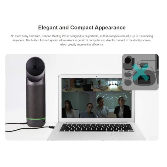 - Camera: Dankzij de 2 FishEye-lenzen biedt de camera van de Kandao Meeting een 360°-zicht op de vergadering met een Full HD 1080p-resolutie. Dit 360°-zicht maakt het mogelijk om alle aanwezige deelnemers in de ruimte vast te leggen. De intelligente camera Kandao Meeting Pro 360 kan de actieve spreker detecteren en zich daarop focussen om deze in beeld te brengen. Ze kan een 360°-weergave behouden, terwijl meerdere deelnemers in een individuele miniatuur worden weergegeven. De laatste modus bestaat uit het weergeven van twee balken met panoramische 180°-weergaven;