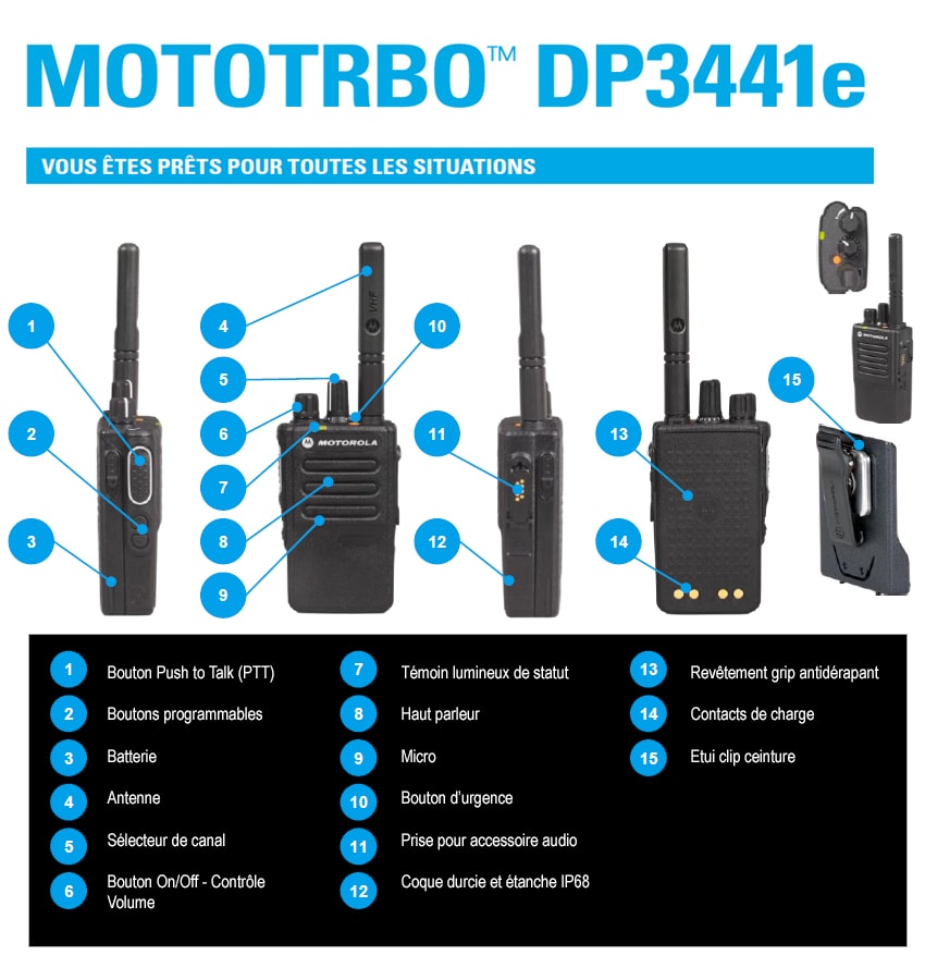 Compact, de Motorola DP3441e-radio is gemakkelijk te vervoeren met zijn korte antenne. Het voldoet aan militaire normen en biedt IP68-bescherming, waardoor het volledig stof- en waterdicht is. Deze robuustheid maakt intensief gebruik in moeilijke omstandigheden of in onherbergzame omgevingen met uitzonderlijke duurzaamheid mogelijk.