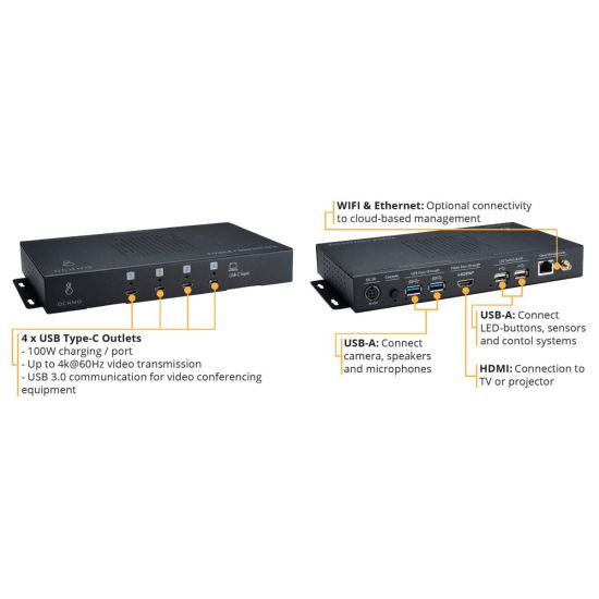 Een essentieel accessoire voor uw vergaderruimtes, de Ochno Power Conference biedt verschillende functies. Het wordt aangesloten op de kamerapparatuur. Poort HDMI maakt verbinding met het scherm of de projector mogelijk, terwijl u via de USB-A-poorten camera's, luidsprekers en microfoons kunt aansluiten.