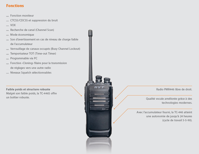 De HYT TC446S is een professionele en veelzijdige PMR446S (vrije frequenties) zender-ontvanger. Nieuw in het HYT-assortiment, biedt het toegang tot een hoogwaardige walkie-talkie vergelijkbaar met de xtn-reeks van Motorola voor een prijs onder de 130 euro.