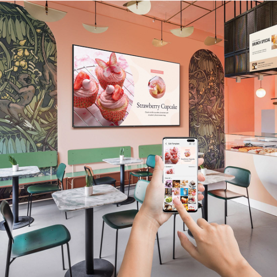 U verspreidt uw promotionele aanbiedingen of berichten via de Samsung Business TV-applicatie, beschikbaar op Android en iOS. U beheert uw promoties, maakt uw aanbiedingen of andere inhoud en verrijkt uw berichten met meer dan 100 vooraf geladen sjablonen.