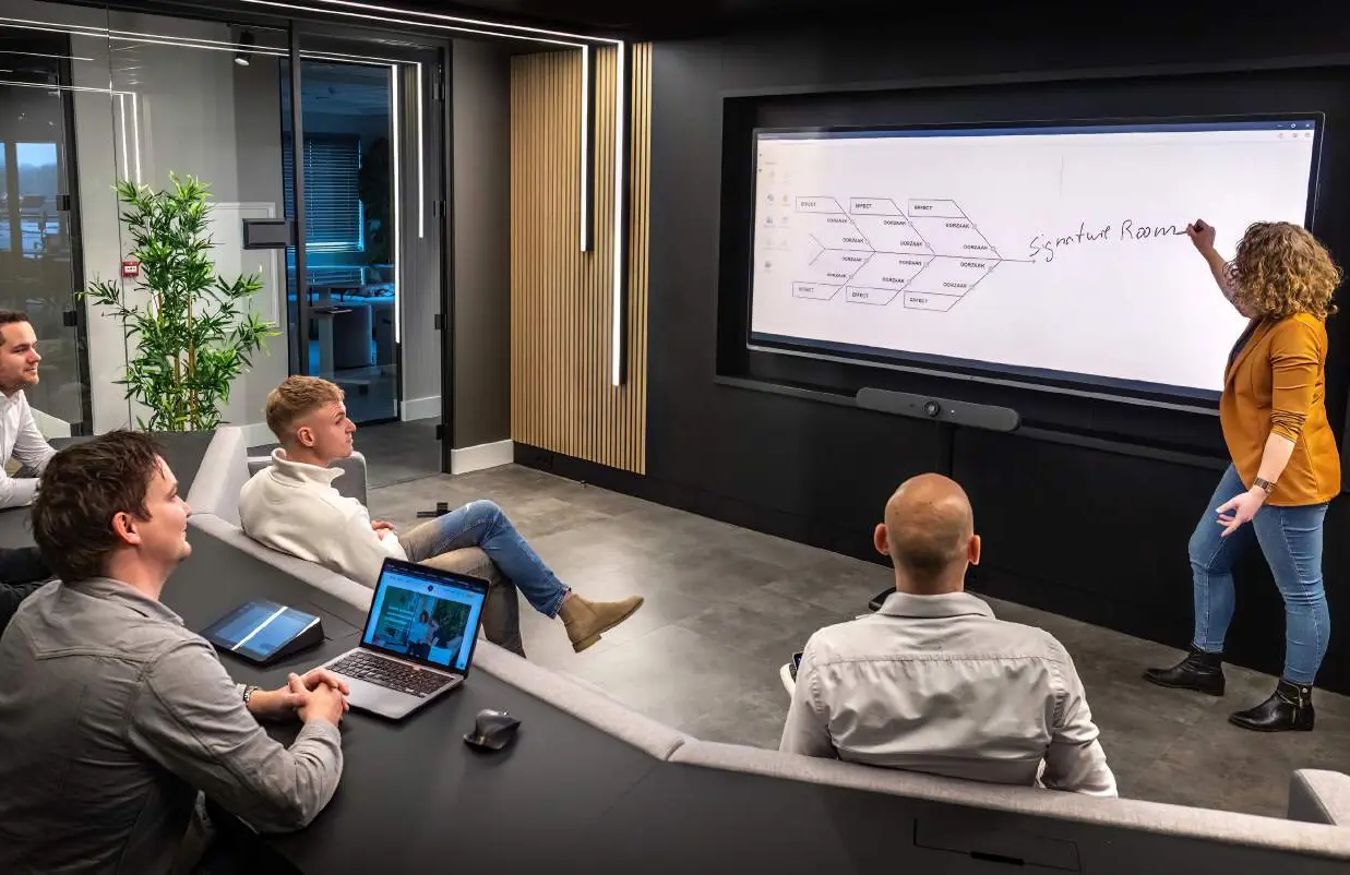 De Signature Teams Rooms, ontworpen door Microsoft Teams , zijn vergaderruimtes die speciaal zijn ontworpen om te voldoen aan de behoeften van hybride werken . Dit zijn premium ruimtes speciaal voor het video conference Teams platform. Ze worden gekenmerkt door een configuratie, meubilair en uitrusting die perfect geschikt zijn voor samenwerking op afstand.